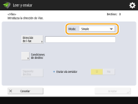 Si desea configurar el equipo para poder consultar el resultado de envío de un documento en la pantalla <Monitor estado/Cancelar>, seleccione <Lleno>. Si no, seleccione <Simple>. Tenga en cuenta que el destinatario también tiene que admitir el modo de transmisión para poder comprobar el resultado del envío. En función del equipo del destinatario, no se permite enviar un I-fax a menos que seleccione <Simple>.