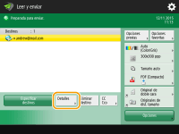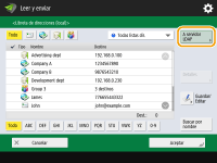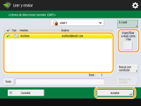 Pulse <Dirección de I-fax>, introduzca el destino y luego pulse <Aceptar>. Pulse <>, introduzca el destino y luego pulse <>. Es preciso especificar el destino en formato como "adv01@ejemplo.com". Para enviar a un dispositivo en la misma red, introduzca el destino en formato como "adv01@192.168.11.100 (dirección nombre@IP del destinatario)".