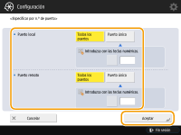 3 | Especifique el puerto al que aplicar IPSec. Pulse <Especificar por n.º de puerto> para utilizar los números de puerto al especificar los puertos a los que se aplica IPSec. Seleccione <Todos los puertos> para aplicar IPSec a todos los números de puerto. Para aplicar IPSec a un número de puerto concreto, pulse <Puerto único> e introduzca el número de puerto. Tras especificar los puertos, pulse <Aceptar>. Especifique el puerto de este equipo en <Puerto local>, y especifique el puerto del interlocutor de la comunicación en <Puerto remoto>. ![]() Pulse <Especificar por nombre servicio> para utilizar nombres de servicio al especificar los puertos a los que se aplica IPSec. Seleccione el servicio en la lista, pulse <Activ./Desac. servicio> para activarlo (<Sí>) y pulse <Aceptar>. ![]() | ||||||||||||||