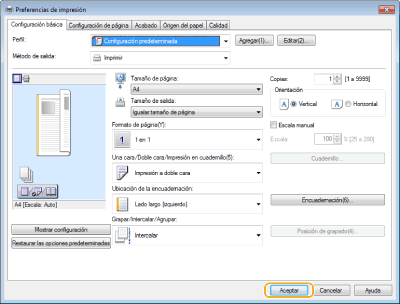Especifique las opciones de impresión según sea necesario y haga clic en [Aceptar].