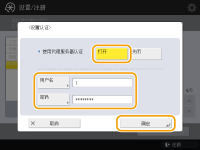 要使用代理服务器认证功能,按此按钮并配置认证信息。在显示的屏幕上,按<打开>,输入用于代理服务器认证的用户名和密码,然后按<确定>。