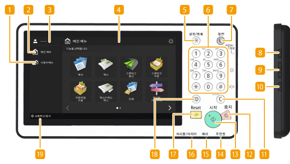 이 단원에서는 조작 패널의 키의 이름 및 용도를 설명합니다.