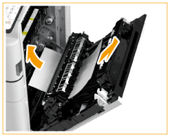 | 용지가 걸리면 화살표 방향으로 부드럽게 당겨 빼내십시오. 용지를 제거할 수 없는 경우 정착기를 원래 위치로 되돌리고 하단 측에서 용지를 부드럽게 당겨 빼십시오. |