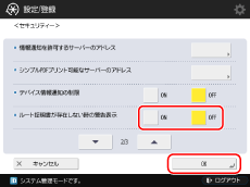 [セキュリティー]を押す→[ルート証明書が存在しない時の警告表示]の[ON]または[OFF]を選択→[OK]を押す