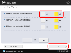 [セキュリティー]を押す→[証明書のCNが一致しない時の警告表示]の[ON]または[OFF]を選択→[OK]を押す