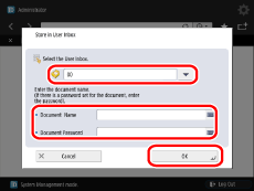 PDF files that are not allowed to be printed due to Adobe Acrobat settings, cannot be stored in a Mail Box. If there is no document password set for the selected PDF file, it is not necessary to enter the document password. After saving a PDF file with a password in a Mail Box, the file becomes a document without a password. To send it as a PDF file with a password, you must reset the password. If a PIN is set for the selected Mail Box, the screen for entering the PIN for the Mail Box appears. To confirm whether the file was stored, check the contents of the Mail Box that was selected as the storing destination. If you want to enter the Document Password, enter the correct password. If the password is entered incorrectly, the file will not be stored in the Mail Box. The Mail Box number, document number, and document password set when saving a PDF file to a Mail Box are cleared when you open a new PDF file. However, if you press [Refresh] to refresh the currently displayed page, these settings are not cleared. |