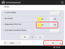 Press [Security] → select [On] for [Display Mixed HTTPS/HTTP Pg] → press [OK].