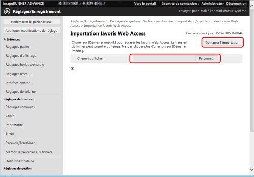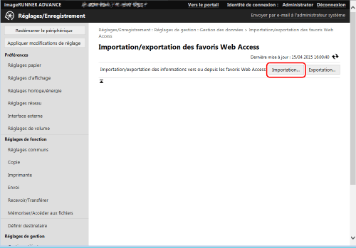 Lors de l'importation de favoris à partir d'un fichier d'ordinateur, les favoris déjà enregistrés dans la machine sont écrasés. Lors de l'importation d'un fichier, utiliser le même format de fichier que celui des données exportées. Les données ayant un format différent ne peuvent pas être importées. |