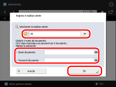 I file PDF per i quali non è consentita la stampa a causa delle impostazioni di Adobe Acrobat non possono essere memorizzati in una mailbox. Se non è stata impostata una password documento per il file PDF selezionato, non è necessario immettere la password. Dopo aver salvato un file PDF protetto da password in una mailbox, il file diventa un documento non protetto da password. Per inviarlo come file PDF protetto da password, è necessario reimpostare la password. Se è impostato un PIN per la mailbox selezionata, viene visualizzata la schermata di inserimento del PIN. Per controllare se il file è stato memorizzato, controllare il contenuto della mailbox selezionata come destinazione del salvataggio. Se si desidera immettere la Password documento, immettere la password corretta. Se la password immessa è errata, il file non viene memorizzato nella mailbox. Quando si apre un nuovo file PDF, il numero di Mailbox, il numero di documento e la password documento impostati per salvare un file PDF in una Mailbox vengono cancellati. Tuttavia, premendo [Aggiorna] per aggiornare la pagina correntemente visualizzata, queste impostazioni non vengono cancellate. |
