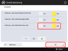Drücken Sie [Sicherheit] → Wählen Sie [Ein] oder [Aus] für [Warn.anz., wenn Gesch.Seit.verlass. wird] → [OK].