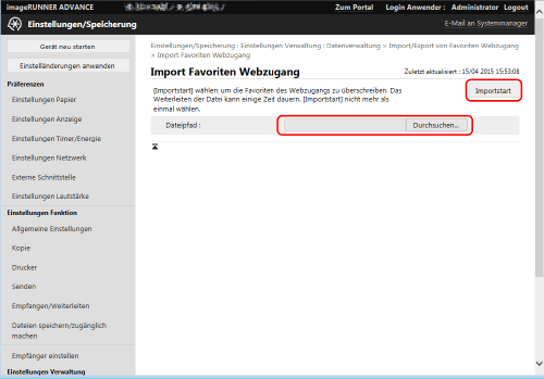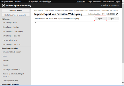 Wenn Sie Favoriten aus einer Computerdatei importieren, werden die bereits registrierten Favoriten im System überschrieben. Beim Importieren einer Datei verwenden Sie das gleiche Dateiformat wie für die exportierten Daten. Daten in einem anderen Format können nicht importiert werden. |
