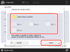 Las versiones que se incluyen en [Intentar todas las versiones] dependen del intervalo especificado en [Especificar vers. permitidas] en [Opciones de TLS] en el equipo. El límite superior e inferior de las versiones de TLS se puede configurar en la opción [Especificar vers. permitidas] de [Opciones de TLS] en el equipo. Para obtener información sobre cómo cambiar la versión de TLS del equipo, consulte "Guía de usuario". Si el motor del navegador está configurado como [WebKit2], al cambiar la configuración se reiniciará el navegador y se realizarán los siguientes procesos. Tenga en cuenta que El motor del navegador no se puede cambiar según el modelo. Se eliminarán las cookies. Se eliminan las cachés. Se eliminarán los registros [Atrás] y [Adelante] La página que se muestra cambia a una página en blanco. |