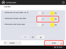 Pulse [Seguridad] → seleccione [Sí] o [No] para [Mostrar aviso al acceder a pág. segura] → [Aceptar].