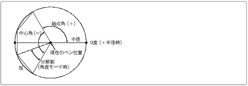 扇形の半径を指定します。 正の値を指定すると中心点から右方向の水平位置が基準点(0度)となり、負の値を指定すると左方向の水平位置が基準点(180度)となります。 座標系は、スケーリングがオフのときはプロッターユニット、オンのときはユーザーユニットになります。 | |||