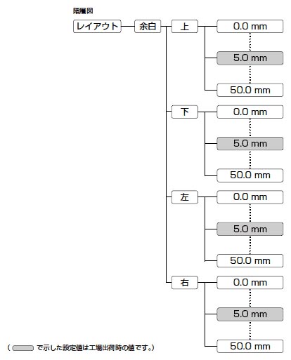 ![]() | 本メニューで指定した余白の範囲は、原稿用紙および出力用紙の両方に適用されます。したがって、用紙を拡大/縮小した場合、ハードクリップ領域は拡大/縮小されますが、余白の範囲だけは同じままです。 拡大/縮小モードと同時に使用する場合は、拡大/縮小後の用紙サイズになります。 メニューのレイアウトグループの「クリップモード」を[パネル]に設定した場合、本メニューで上下左右の余白を設定できます。 PSコマンドにより用紙選択が行なわれた場合は、本メニューで指定した上下左右の余白値は無視されます。 メニューのレイアウトグループの「クリップモード」を[データ]に設定した場合でも、ユーザー定義用紙が原稿用紙として選択されたときは、本メニューで指定した上下左右の余白値が設定できます。 |