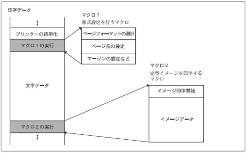 たとえば、ページの書式(ページ長やマージンなど)を決める一連の制御命令をマクロに登録しておけば、そのマクロを呼び出すだけで、いつも同じ書式で印字を行うことができます。また、同じイメージを印字する場合などは、その印字データをマクロに登録しておけば、印字のたびにイメージデータを送る必要がなくなります。