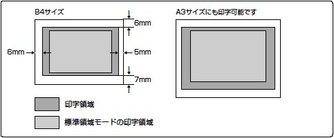 B4サイズでは、標準領域モードでページフォーマットの印字領域と用紙の有効印字領域にあまり差がないため、ワイド領域モードにしてもあまり効果がありません。