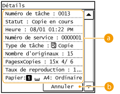 Le nombre de copies, les réglages ainsi que d'autres détails s'affichent. Si vous souhaitez examiner les détails sans annuler la copie, appuyez sur