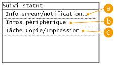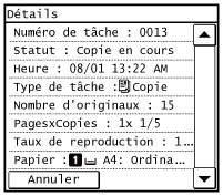 Affiche le statut actuel de l'élément sélectionné. L'écran <Statut tâche Copie/Impression> est illustré à titre d'exemple ci-dessous.