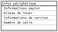 Affiche l'état de l'appareil tel que la quantité de papier ou d'encre encore disponible.