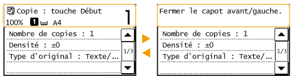 Un message s'affiche parfois en haut de l'écran ; par exemple, lorsque l'encre est presque épuisée ou si un capot est resté ouvert. L'affichage passe du mode d'écran normal à l'affichage du message.