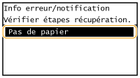Dans certains cas lorsqu'une erreur se produit, des consignes permettant de remédier à l'erreur s'affichent. Appliquez les instructions figurant à l'écran pour résoudre le problème. L'écran apparaissant en cas de bourrage papier est illustré ci-dessous à titre d'exemple (