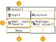 L'écran <Accueil> concernant le début des opérations, ainsi que les écrans destinés à définir les réglages s'affichent. Vous pouvez également voir ici la progression des tâches et les messages. Appuyez sur l'écran pour l'utiliser.