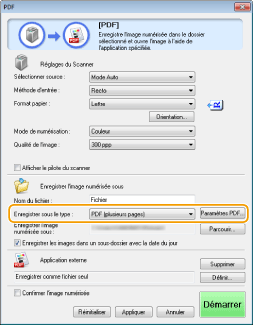 ), [Créer un fichier PDF selon] s'affiche à la place de [Enregistrer l'image numérisée sous]. Dans ce cas, cliquez sur [Parcourir] et indiquez un fichier PDF auquel vous voulez ajouter les données du document qui vient d'être numérisé. Les données sont ajoutées au fichier existant sous forme de pages supplémentaires.