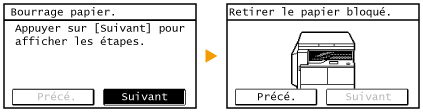 En cas de bourrage papier, le message <Bourrage papier.> s'affiche à l'écran. Appuyez sur <Suivant> pour examiner les solutions les plus simples. Si vous avez des difficultés à comprendre les procédures apparaissant à l'écran, consultez les sections suivantes pour éliminer les bourrages papier.