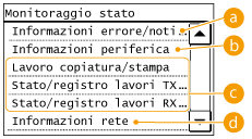, viene visualizzata una schermata che consente di controllare lo stato dei documenti in corso di stampa, invio o ricezione, oltre allo stato della macchina, ad esempio il livello di toner oppure le informazioni sull'impostazione di rete, come l'indirizzo IP della macchina.