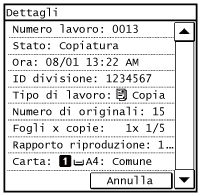 Visualizza lo stato corrente della voce selezionata. La schermata <Stato lavori copiatura/stampa> viene illustrata di seguito come esempio.
