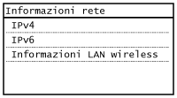 Visualizza le impostazioni di rete come l'indirizzo IP della macchina e lo stato come la condizione delle comunicazioni LAN wireless.