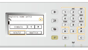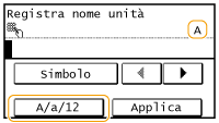 o toccare <Simbolo> quando il tipo di testo immesso è <A> o <a> per visualizzare i simboli disponibili per la schermata. Toccare i simboli per immetterli. |