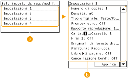 È possibile registrare fino a quattro combinazioni di impostazioni di copia utilizzate frequentemente. Semplicemente selezionando, quando necessaria, un'impostazione registrata, sarà possibile eliminare la necessità di configurare le stesse impostazioni ogni volta che si eseguono copie, ad esempio se si imposta frequentemente il numero di copie a 5 impostare <Cancellazione bordi> a <On> e aumentare la nitidezza quando si copia. È possibile registrare le combinazioni di impostazioni da <Impostazioni 1> a <Impostazioni 4>.