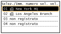 Visualizza tutte le destinazioni registrate nella Rubrica. Per i contrassegni all'interno delle destinazioni, vedere le spiegazioni di seguito.