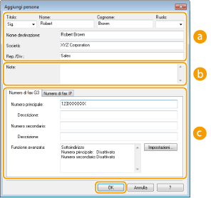 Immettere i numeri di fax. È possibile separare, se necessario, i numeri con trattini. Se si desidera aggiungere spiegazioni degli usi dei numeri di fax, come "Casa" o "Ufficio", immetterle in [Descrizione].