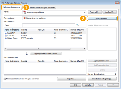 Per modificare o eliminare destinazioni registrate, selezionare una destinazione da [Rubrica] e fare clic su [Modifica] o [Elimina].