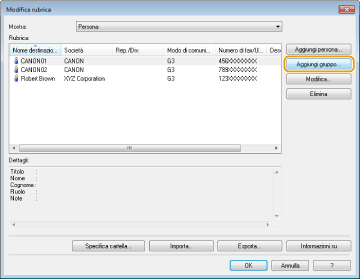 In questa sezione viene descritto come registrare le destinazioni nella Rubrica per i fax da PC. È possibile selezionare singole destinazioni tra quelle registrate nella Rubrica per creare una destinazione di gruppo (Selezione gruppo), utile quando si inviano fax a più destinazioni contemporaneamente.