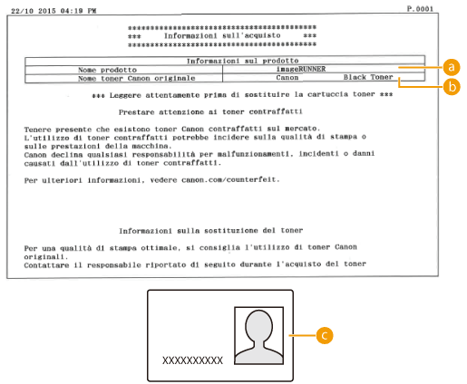 È possibile acquisire e registrare la documentazione del rivenditore autorizzato Canon locale (biglietto da visita, informazioni e così via) in modo da poter stampare le relative informazioni di contatto quando si esauriscono i materiali di consumo.