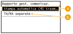 Toccare <On> per stampare separatamente i rapporti di invio e ricezione o <Off> per stampare entrambi i rapporti su un solo foglio.