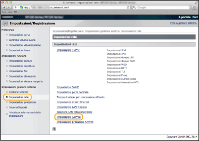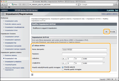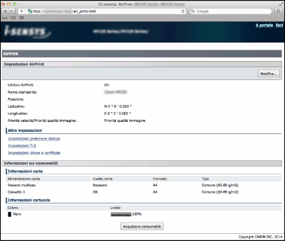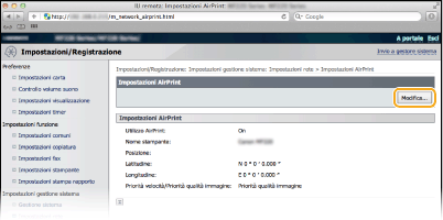 È possibile registrare le informazioni, compresi il nome della macchina e la posizione di installazione, utilizzate per identificarla. È inoltre possibile disabilitare la funzione AirPrint della macchina. Utilizzare la IU remota per modificare tali impostazioni.
