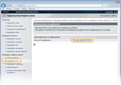 Fare clic sul collegamento dell'URL visualizzato per [URL per la registrazione].