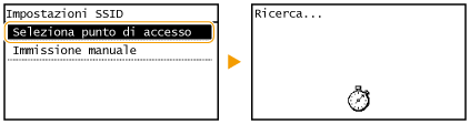 È possibile cercare i router wireless (o punti di accesso) disponibili per la connessione e selezionarne uno dal display della macchina. Per la chiave di rete, inserire una chiave WEP o TKIP. Prima di selezionare un router wireless, verificare e annotare le informazioni necessarie all'impostazione, inclusi SSID e chiave di rete (