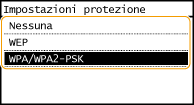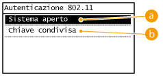 ![]() Quando viene selezionato <Sistema aperto> Quando si collega a una LAN wireless la macchina rileva un errore di autenticazione se la chiave di autenticazione condivisa è impostato sul router wireless. Se ciò accade, la macchina modifica automaticamente l'impostazione su <Chiave condivisa> e riprova a connettersi. |