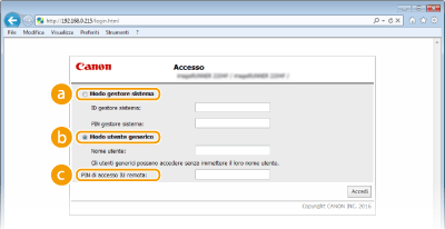 È possibile eseguire tutte le operazioni dell'IU remota e configurare tutte le impostazioni. Immettere l'ID appropriato in [ID gestore sistema] e il PIN in [PIN gestore sistema] (