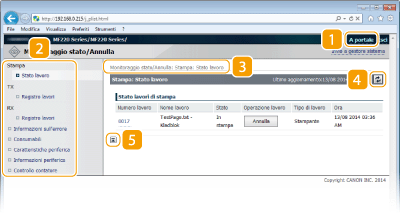 Visualizza lo stato dei documenti di stampa correnti e la cronologia di stampa, copia, invio e documenti ricevuti. È inoltre possibile controllare lo stato della macchina.