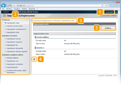 Visualizza la pagina [Impostazioni/Registrazione]. Dopo aver eseguito l'accesso in modalità Gestore sistema, è possibile modificare le voci di impostazione e salvare/caricare i dati registrati.