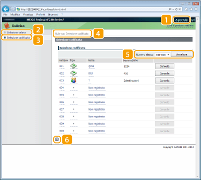 Visualizza i numeri a selezione codificata registrati nella Rubrica. Se è stato effettuato l'accesso in modalità Gestore sistema, è inoltre possibile registrare o modificare la rubrica.