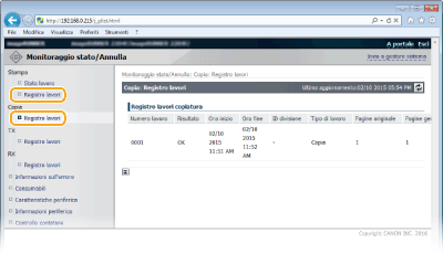 La cronologia di stampe, copie, fax inviati o ricevuti (RX) viene visualizzata. È possibile visualizzare fino a 50 lavori recenti per volta.