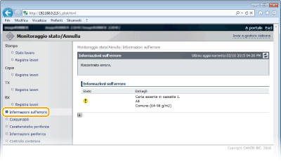 Se si verifica un errore, viene visualizzata questa pagina facendo clic sul messaggio visualizzato in [Informazioni sull'errore] nella Pagina portale (pagina principale).